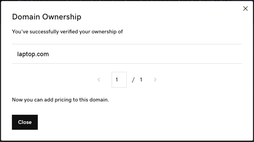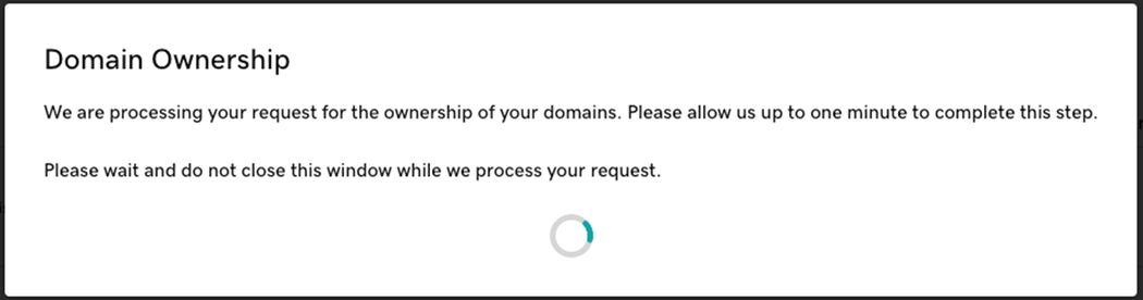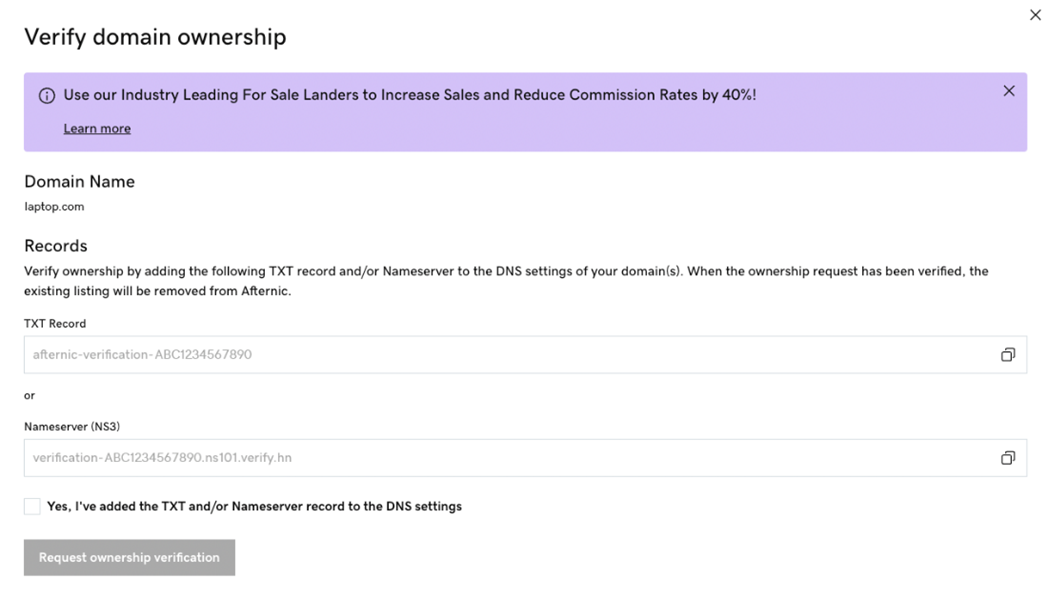 If TXT and nameserver records are already set, it’s likely that ownership verification can be completed within a minute. If so, Afternic will confirm that you’ve successfully verified ownership in the on-screen pop-up.