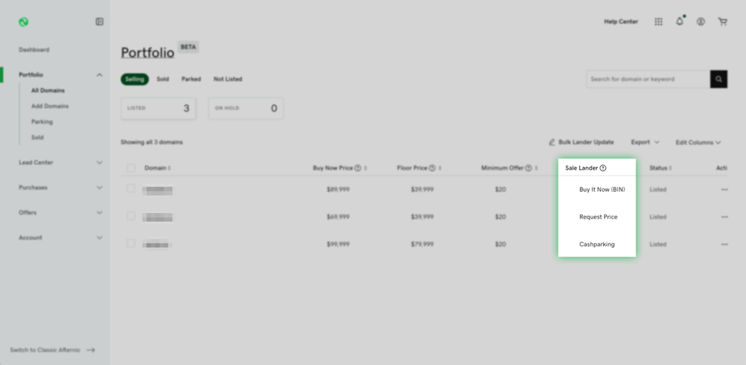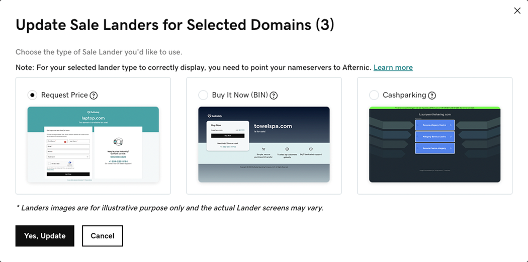 In short, if you would like to change between Request Price, Buy it Now (BIN), and Cashparking landing pages, you will now need to do so by updating the new Sales Lander settings within your Afternic Portfolio dashboard.