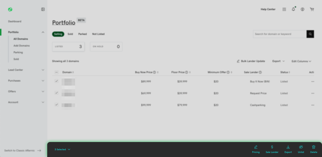 Selecting domain names using the on-screen checkboxes will prompt Afternic’s toolbar to appear at the bottom of your screen.