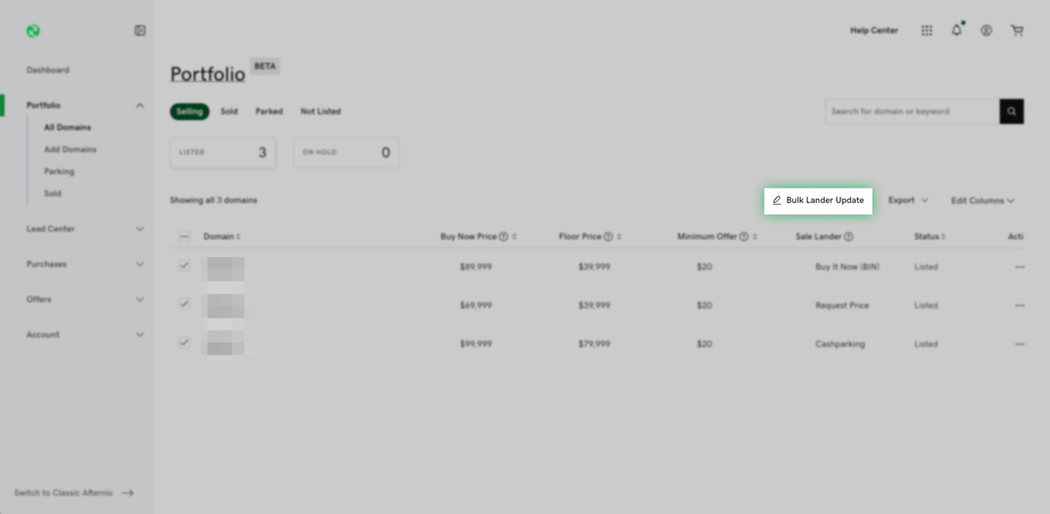 For customers already using Afternic nameservers, you will now use Afternic’s portfolio dashboard to update your landing page settings either individually or in bulk.