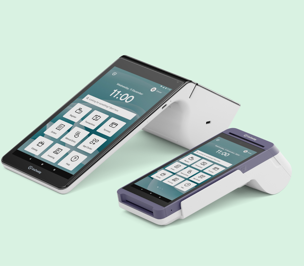 GoDaddy offers a range of versatile POS systems to match your business needs, each designed to impress your customers and streamline checkout. For countertop use, the sleek Smart Terminal Duo features a dual-screen setup so customers can easily tip, sign, and interact with your brand. The compact, handheld Smart Terminal Flex is perfect for taking payments anywhere in your store.
