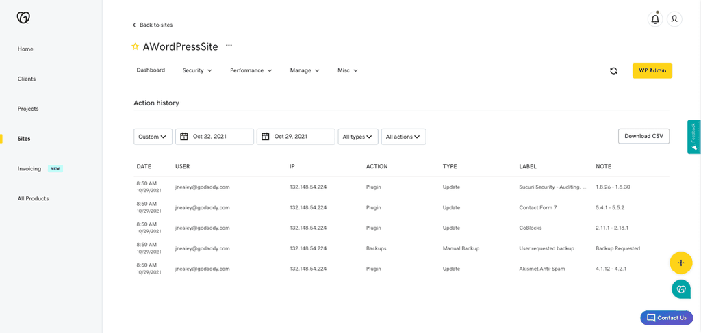 From the Sites list in the Hub, you can check out a site's history by going to the menu button in the upper right, and then clicking Action History. From here, you can view a report of all the actions taken in The Hub