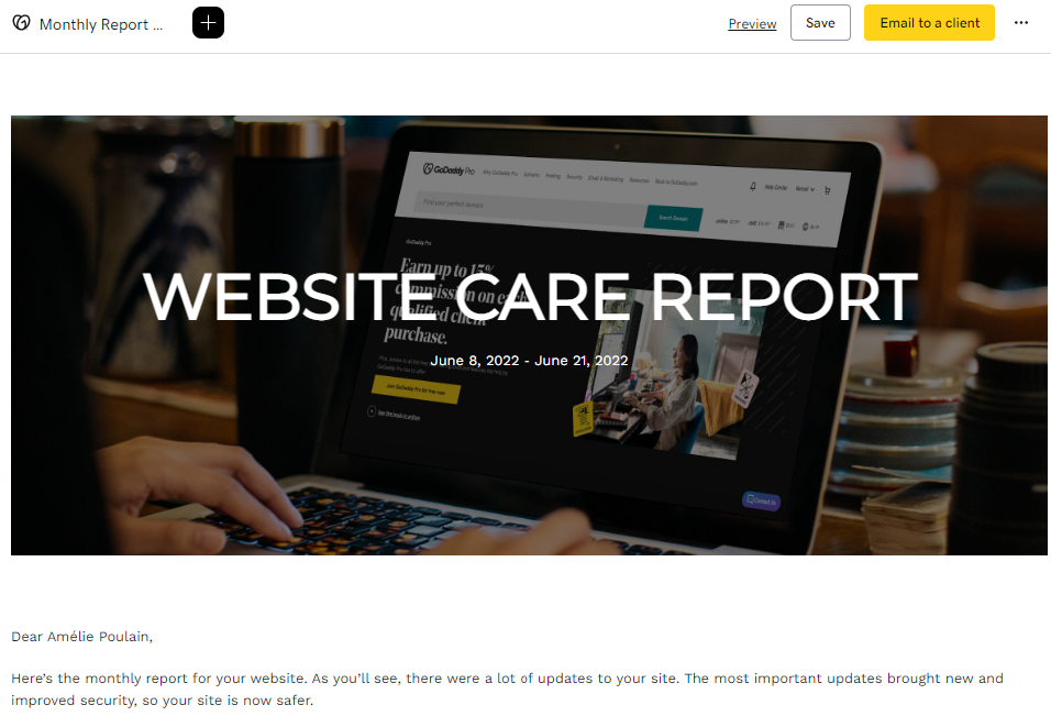 We're thrilled to unveil our enhanced client reports feature in The Hub by GoDaddy Pro. Now packed with customizable blocks and widgets, it's easier than ever to showcase the care you put into your clients' websites. Using the familiar Gutenberg editor, anyone comfortable with WordPress can quickly create detailed, visually appealing reports. These monthly reports are essential—they help demonstrate the value of your services and strengthen your relationships with clients by making the benefits of regular website maintenance clear. It's an excellent way to highlight your role in their business success and justify the investment in your services.