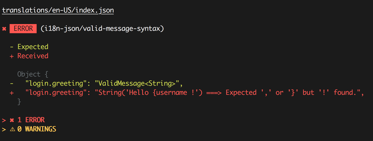 Here’s how the plugin would catch the invalid ICU Message syntax from above: