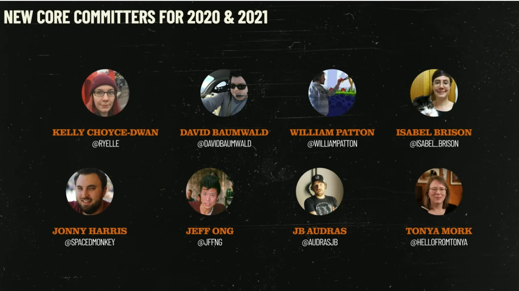 This year, eight new core committers were added: Kelly Choyce-Dwan, David Baumwald, William Patton, Isabel Brison, Jonny Harris, Jeff Ong, JB Audras, and Tonya Mork.