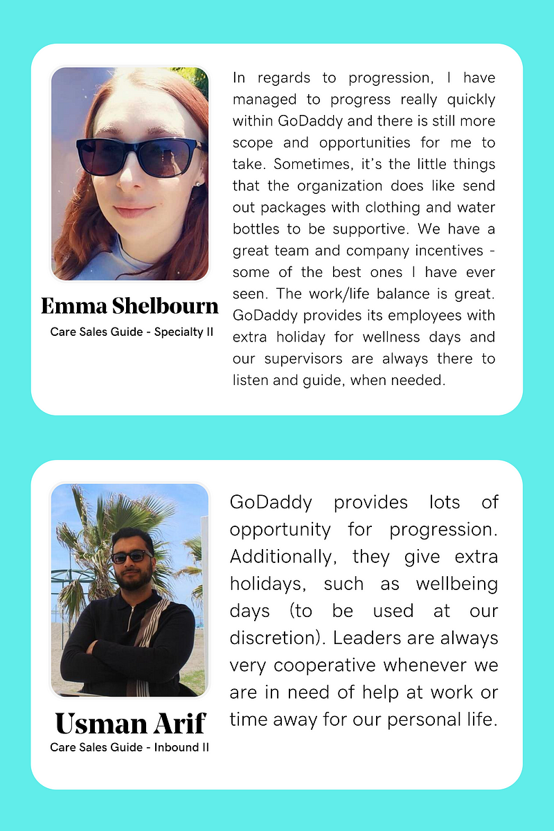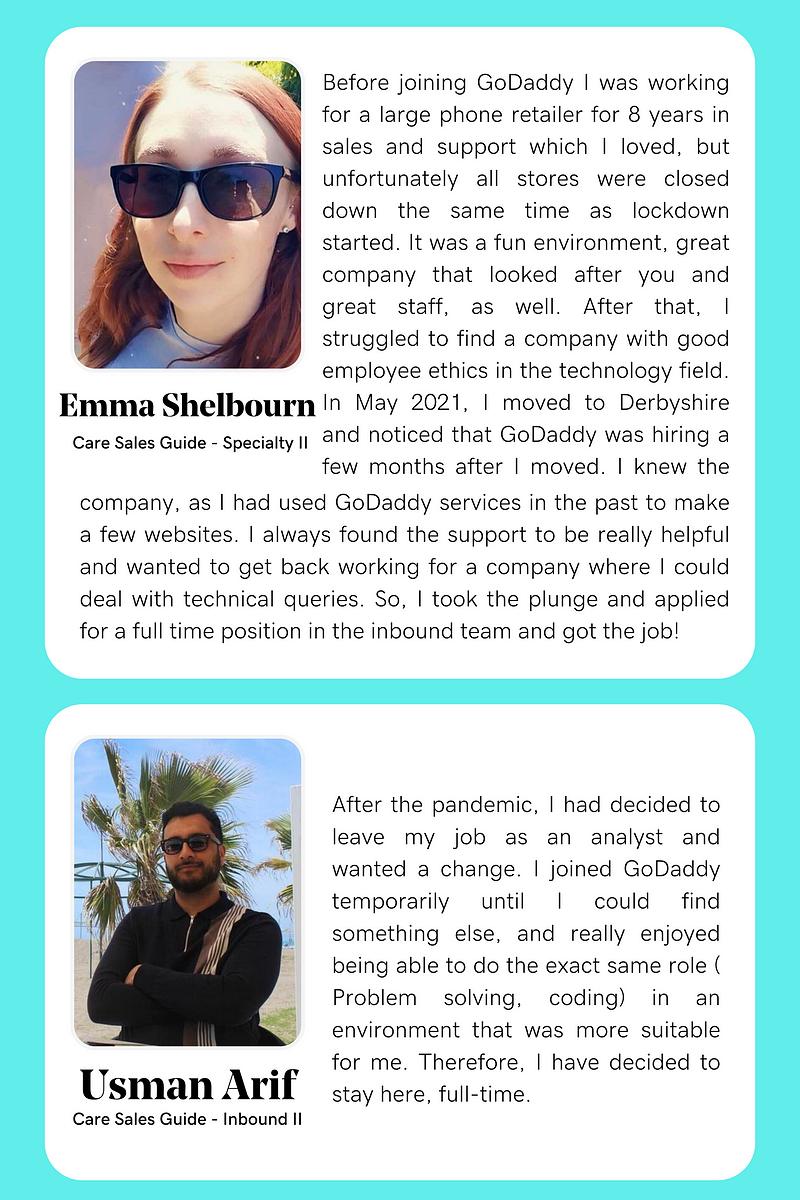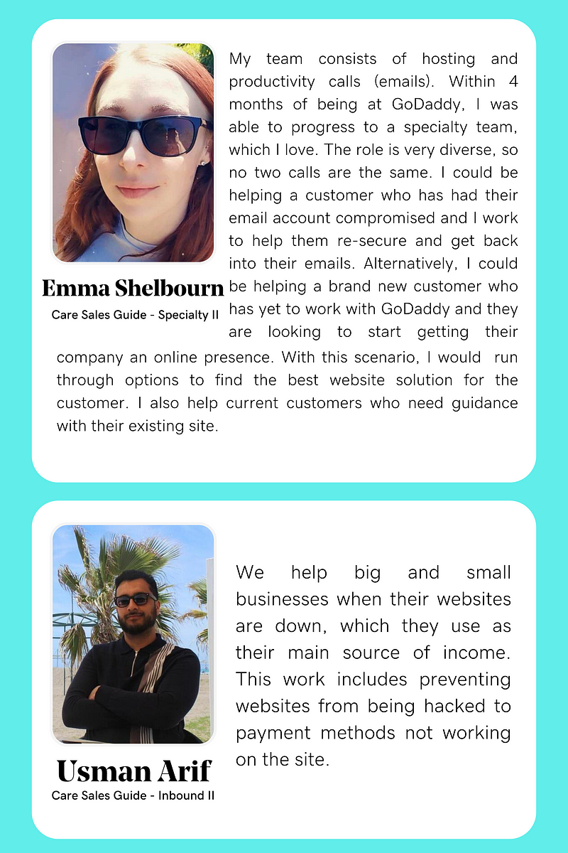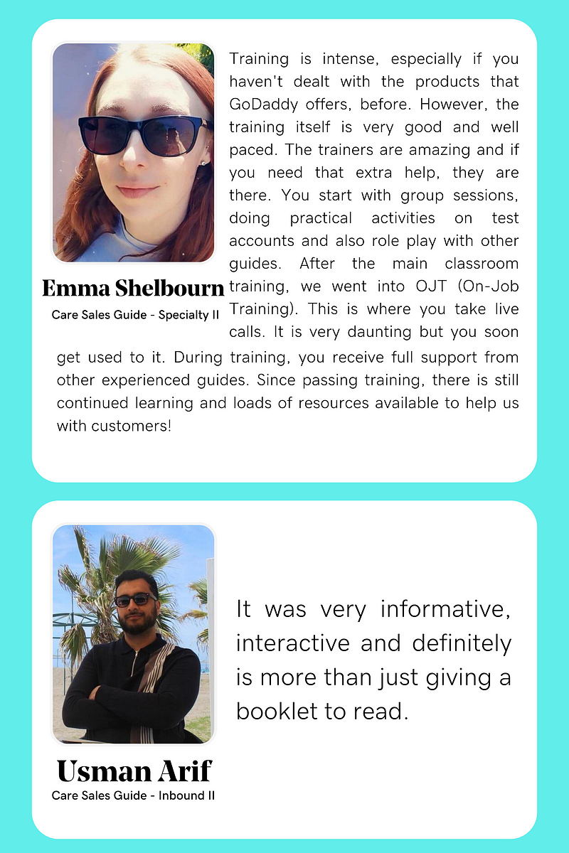 We spoke with a few guides, based in the UK, who have recently undergone the training and are excelling in their roles here at GoDaddy. Take a look at what they have to say about the program!