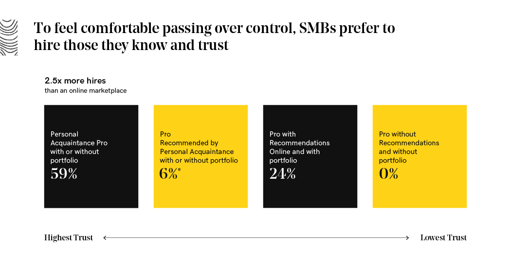 The clients we interviewed also placed a high value on trust, with a significant majority preferring to hire a personal acquaintance. In fact, service providers with that personal relationship were 2.5 times more likely to get hired over someone recommended through an online platform. Here are more key insights from the data: In fact, service providers with that personal relationship were 2.5 times more likely to get hired over someone recommended through an online platform. Here are more key insights from the data: