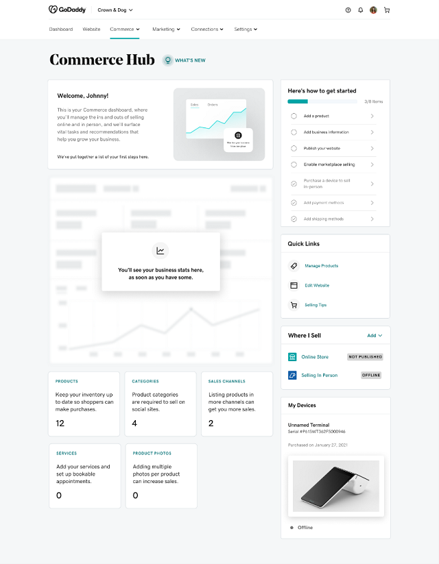The new GoDaddy Commerce Hub unifies operations and sales information from across all the ways that you sell. The Commerce Hub will help you to get set up to sell on all your intended sales channels and it will consolidate all your sales information once you start making sales.