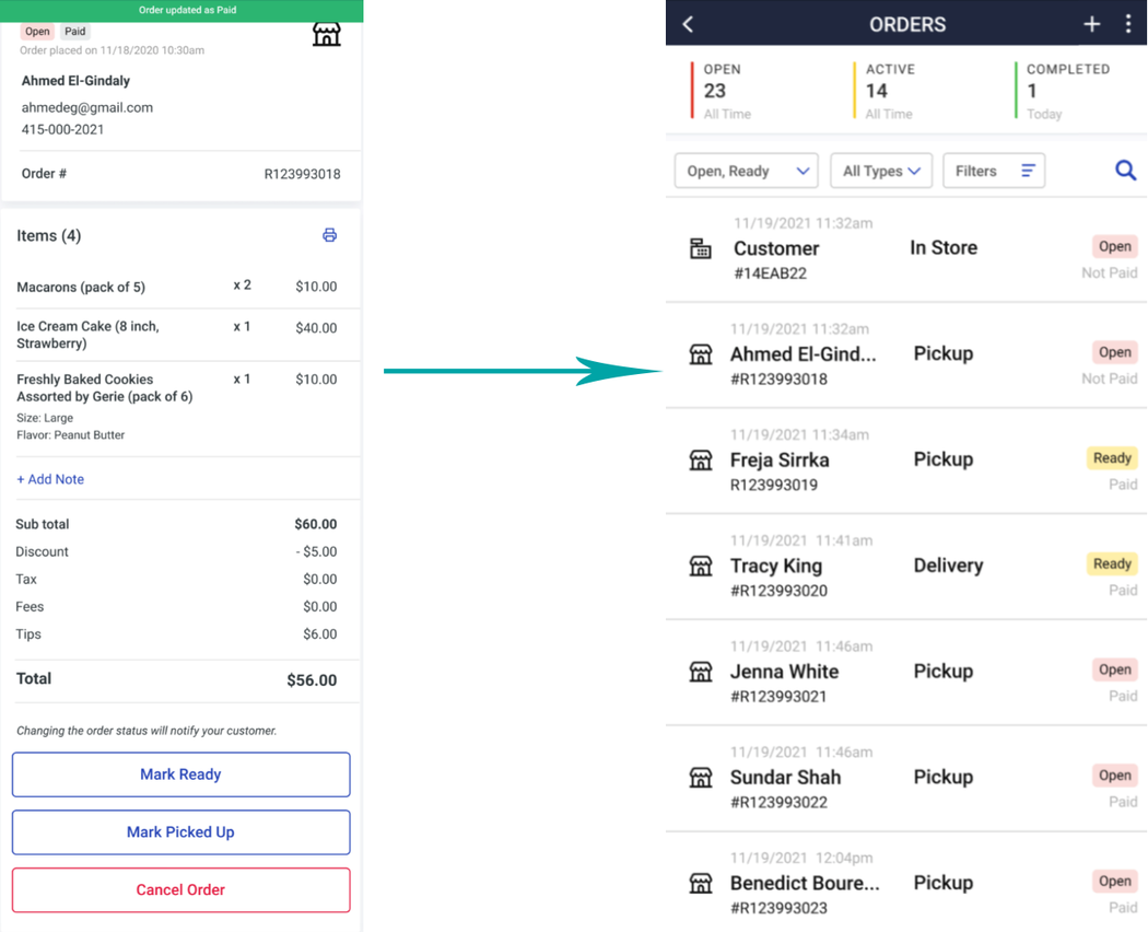 Online orders for pick-up and delivery are also integrated with your Smart Terminal. Customers can pay for their order in person using credit cards or contactless payment, and you can update the status of the order from your Smart Terminal. The order will automatically update in your Online Store.