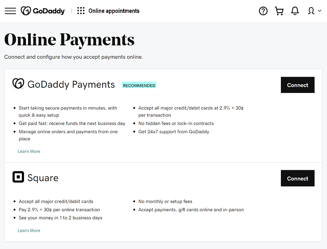 Online Appointments customers can now use GoDaddy Payments to offer more flexibility payment options. When using GoDaddy Payments with Online Appointments, customers can: