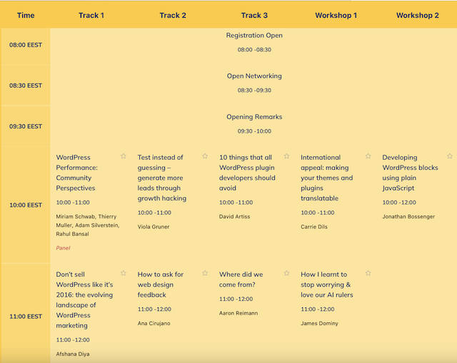 Traditional tracks consist of various speaker sessions spread out throughout the day. You can often find discussions and presentations on topics ranging from marketing to web development and much, much more.