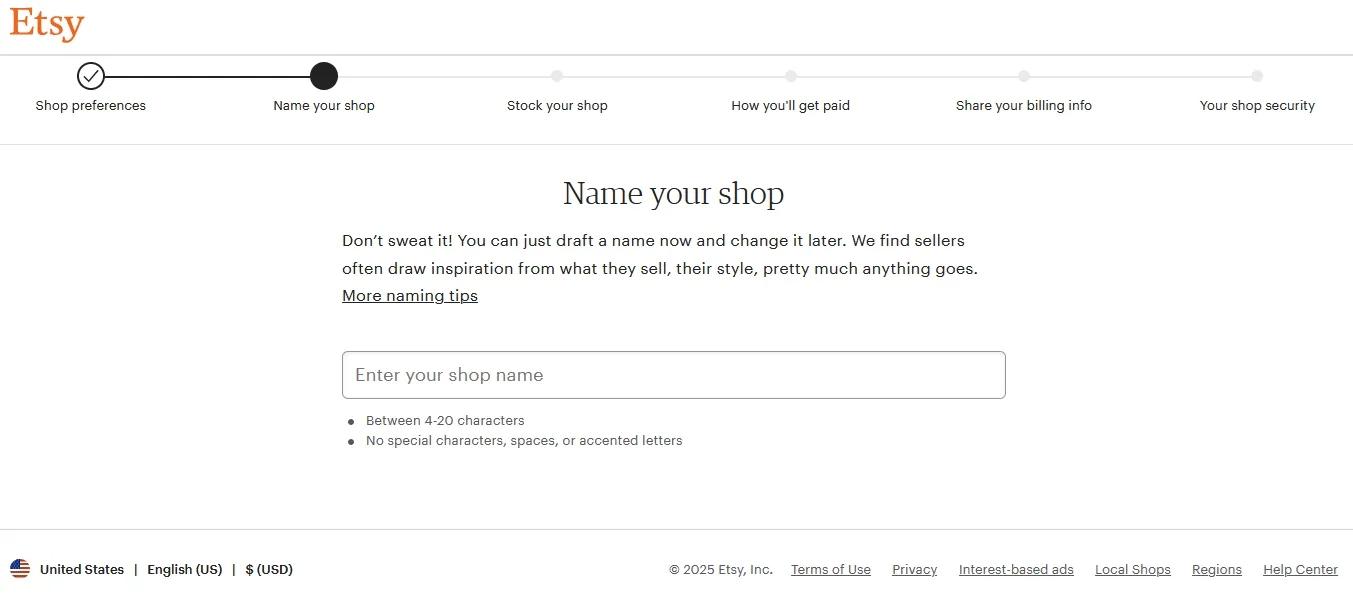 Next, enter the shop name that you chose in the first steps of this process. If you’re still unsure about your store name, consider using GoDaddy’s Business Name Generator to come up with a great store name. You may change your name later from Etsy’s store manager.