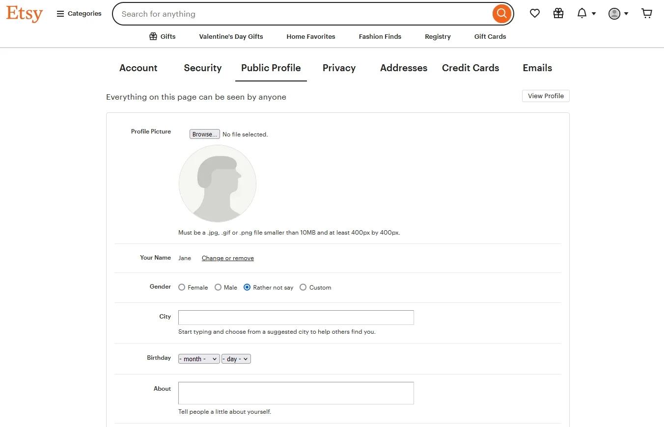 Once you’ve created an account, you can update your personal profile. This will help shoppers learn more about you and the materials you use in your products. To update your profile, select the user icon in the top right corner and click “View your profile,” then click ”Edit public profile” on the next page.