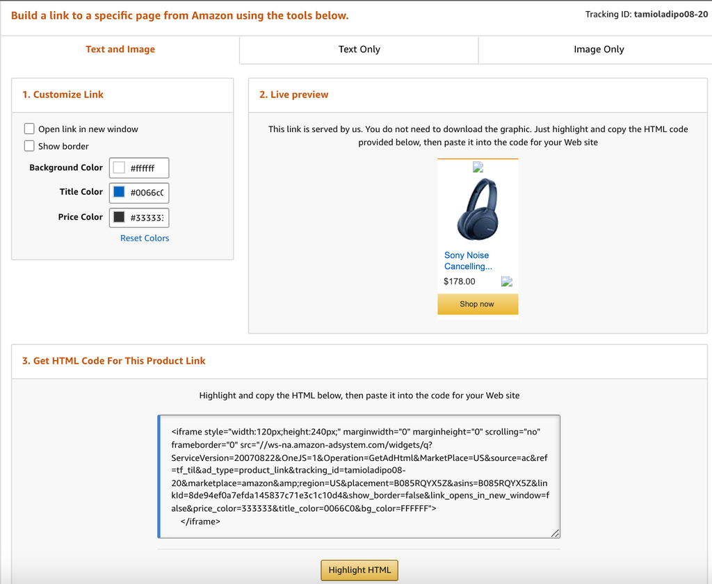 A box will pop up with your affiliate link, and you can copy the HTML code for your site as-is, or you can customize it first. Your ad can be an image and text, just text or an image only. You can also customize the look of the ad. For example, you could change the title or price color to match the branding of your website.
