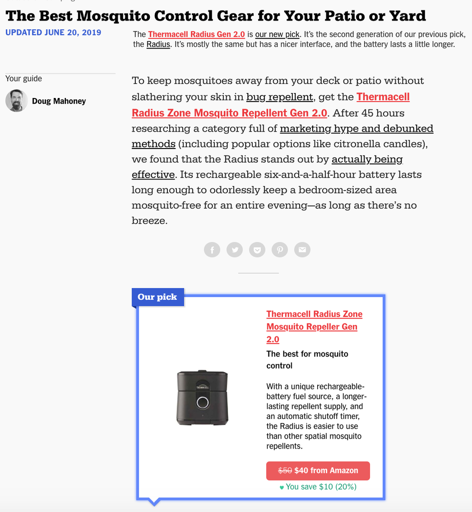 Writing roundups of a few similar products can be effective. This could include reviews of the “The 5 Best Handheld Mixers” or creating a roundup of several reviews that declares a winner and a runner-up, such as “The Best Fitness Tracker You Can Buy on Amazon.” For example, in the screenshot from Wirecutter below, the writer reviewed a few mosquito control devices and identified the top pick that performed the best.