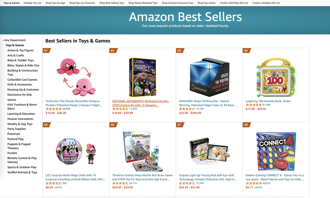 Another helpful resource is Amazon’s best-selling products page for toys and games. Products on these pages are updated hourly and ranked based on which products have the most sales. By analyzing the types of products on these pages, you can decide which toy or game to invest in and sell on Amazon yourself. If your toy or game gains momentum, Amazon will reward you by boosting the product visibility with a feature on one of these best-selling pages.