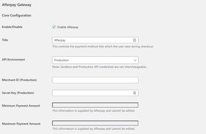 Find the Merchant ID and Secret Key within your Afterpay account and add them to the corresponding fields. Once you save the credentials, the Minimum Payment Amount and Maximum Payment values will appear.