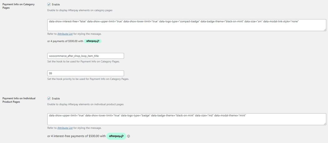 I recommend enabling the payment details for individual product pages but disabling them on category pages. If enabled on category pages, the payment badge and calculated installment cost will appear next to every product. This can be excessive, especially if your site uses autoload to show a bunch of products.
