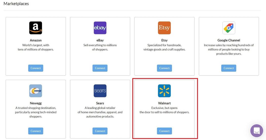 This will take you to a page with a list of all the platforms that you can connect to Sellbrite. Find Walmart at the end of the Marketplaces section and click Connect.