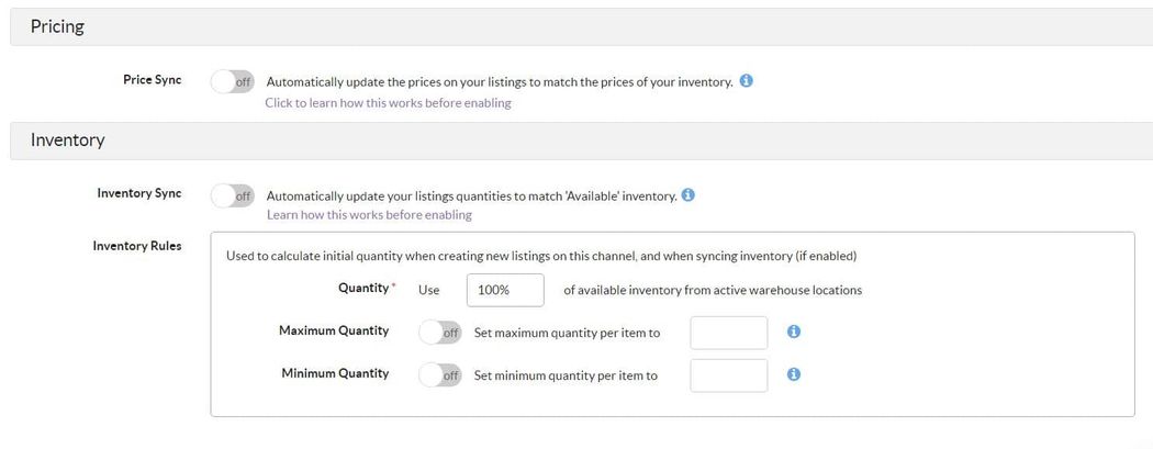 Further down, you’ll have the option to enable syncing for your prices and inventory. By activating this setting, changes to your prices and/or available inventory in Sellbrite will be pushed back to your WooCommerce store.
