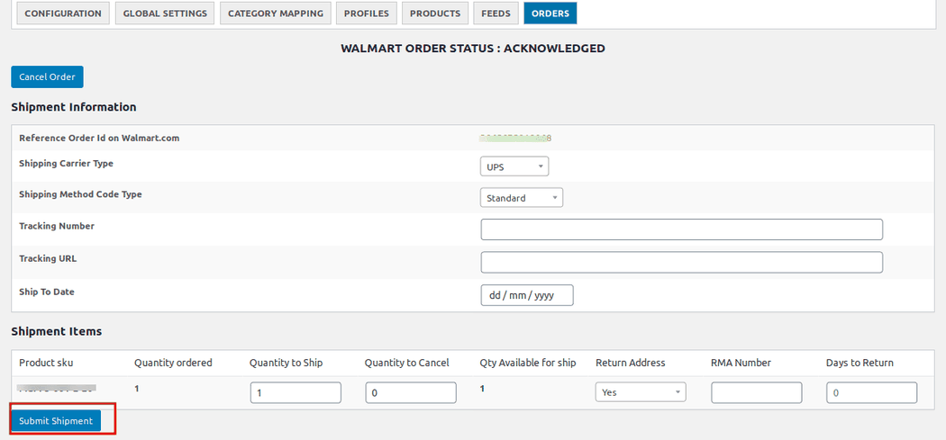 If you want to process the shipment click the Edit button. This will open a page where you can upload the tracking information. Click Submit Shipment when you are done and Walmart will automatically update your order to Shipped.