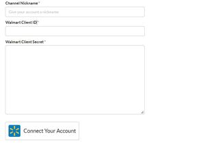 The following page will present a form for you to enter your API credentials. Paste the Client ID and Client Secret that you copied from Walmart into corresponding fields and click Connect Your Account.
