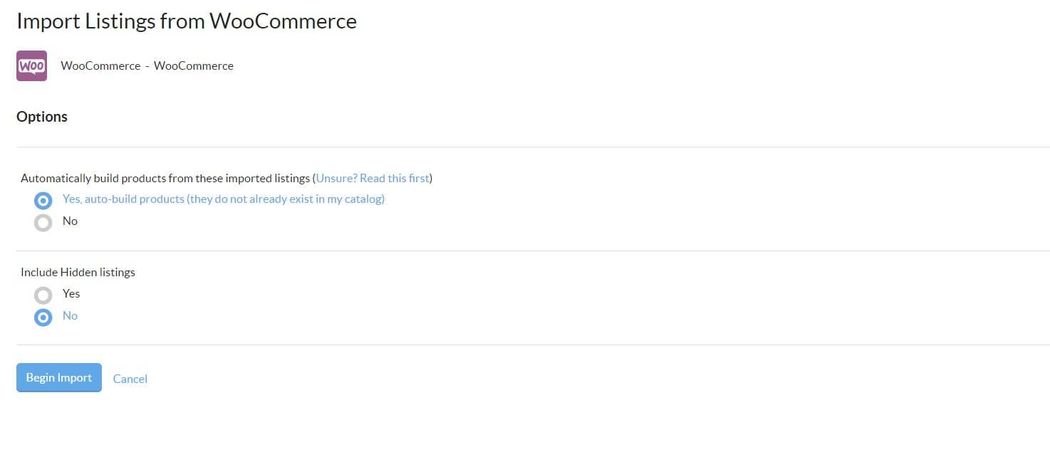 The second setting you can configure for the import is to include or exclude hidden listings. After you’ve determined both of these settings, click Begin Import to begin adding your WooCommerce items to Sellbrite.