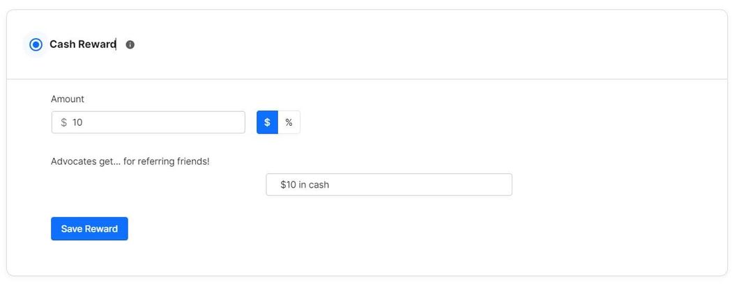 Cash rewards allow referrers to earn a direct cash payment for each person they refer. This can be a fixed cash amount like a $10 payment per referral. Or it can be a percentage of the value of the referee’s purchase. For example, the referrer would get a $5 payment if you set a 5% cash reward and the referee makes a $100 order.