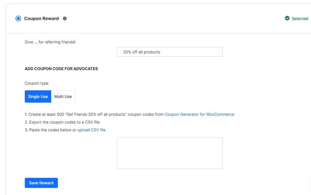 Coupons can be single or multi-use. If you plan to use single-use coupons, you’ll need to upload a list of coupon codes from the Rewards section of your ReferralCandy dashboard.