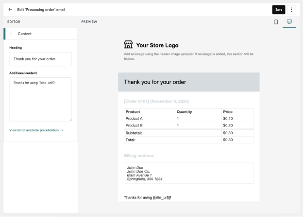 The native WooCommerce can automatically send transactional emails for specific events throughout the customer journey — for example, when someone completes an order and needs an order confirmation with the purchase details.