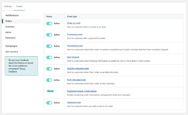 The screenshot above shows the email interface. On the dashboard, you can see the emails, the format (HTML), the recipients, and the manage button. Through the management button, you can customize emails and toggle them on and off; we’ll share the process for that in detail later.