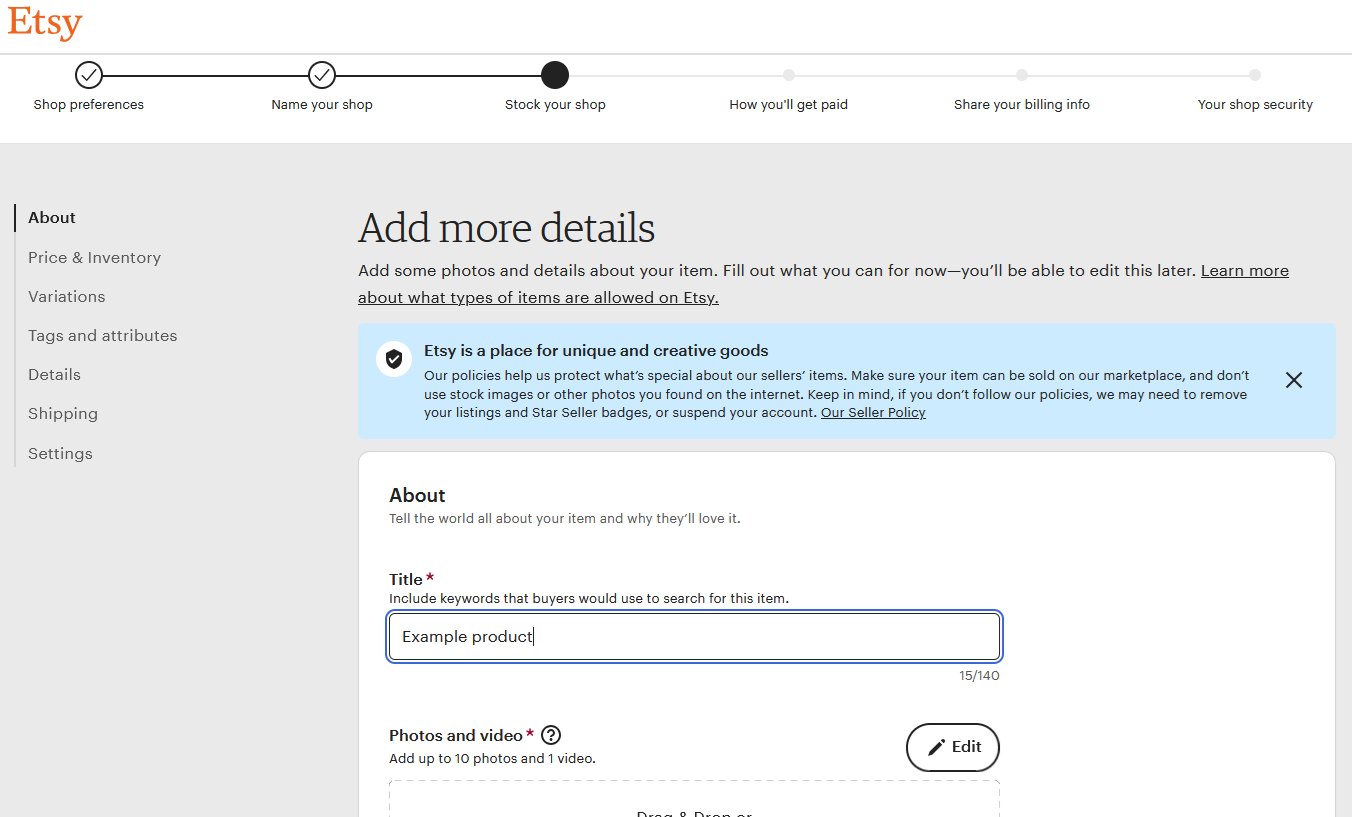 In the listing details, you can add your product’s name, category, description, and other high-level information.