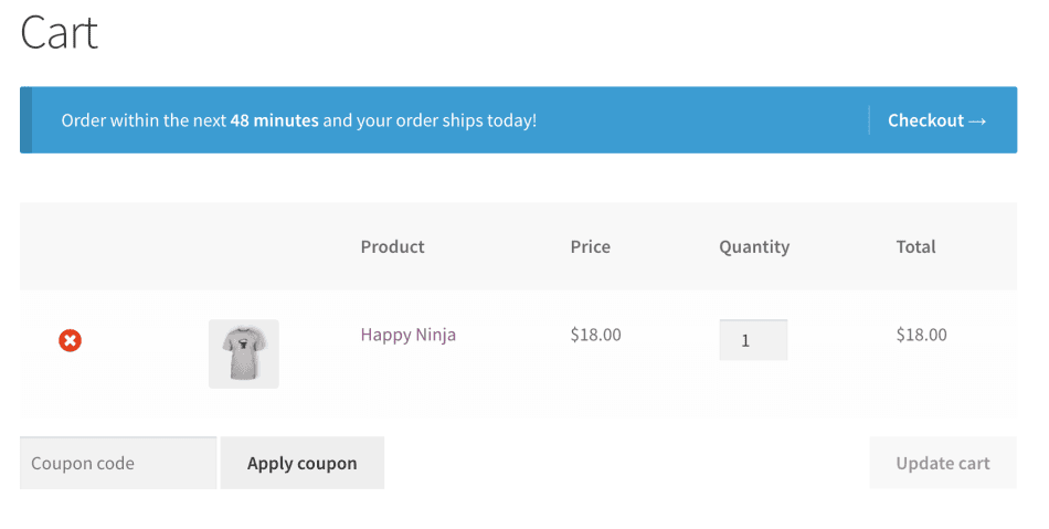 Cart Notice is $49/year and adds dynamic notices to your cart. In the screenshot above, the message reads, “Order within the next 49 minutes and your order ships today!”
