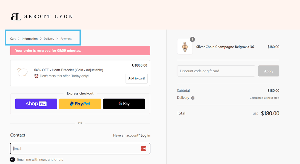 Here’s an example from Abbot Lyon that marks each step in their checkout flow (Information > Cart > Information > Delivery > Payment). The step the user is on is bold.