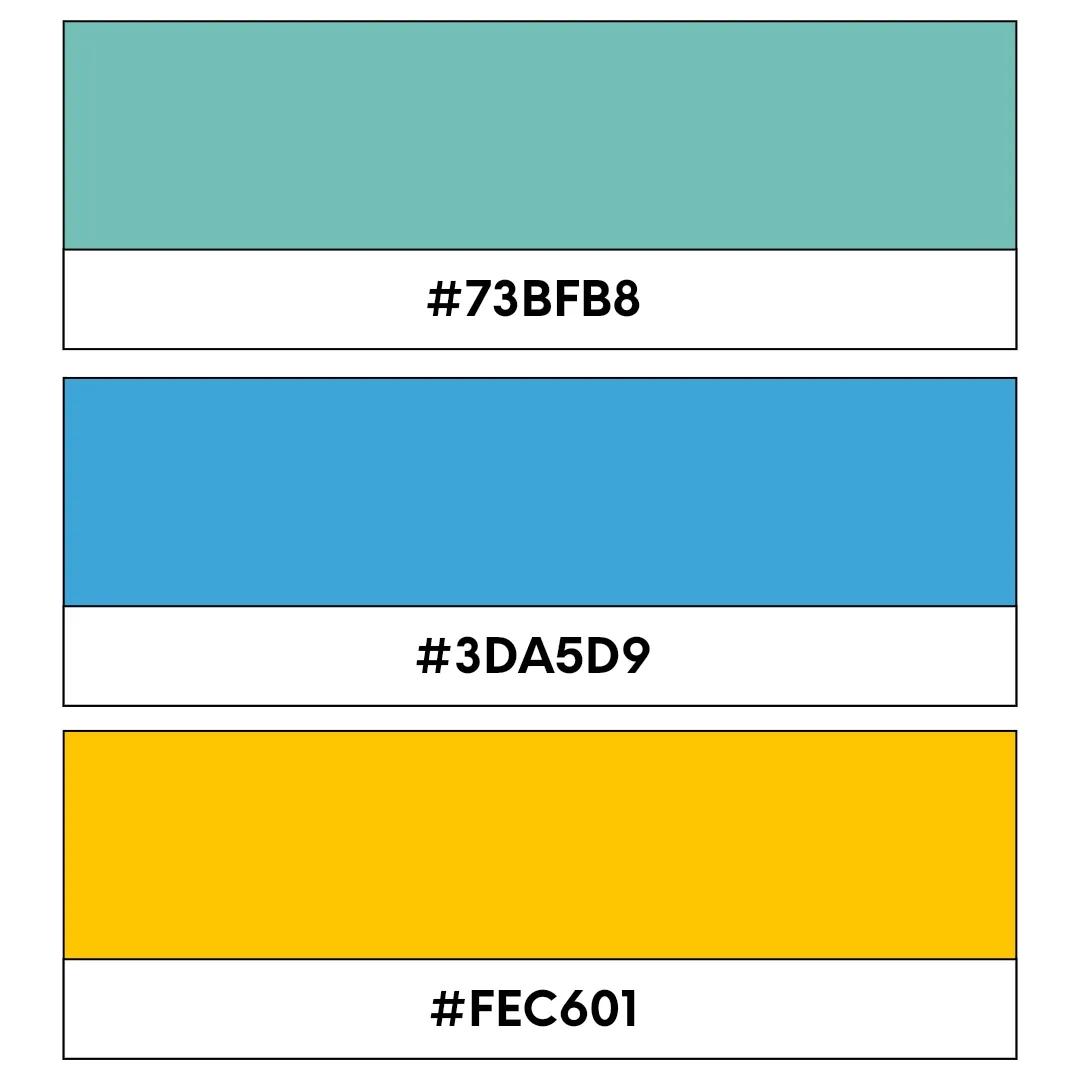 Green code: #73BFB8, Blue code: #3DA5D9, Yellow code: #FEC601