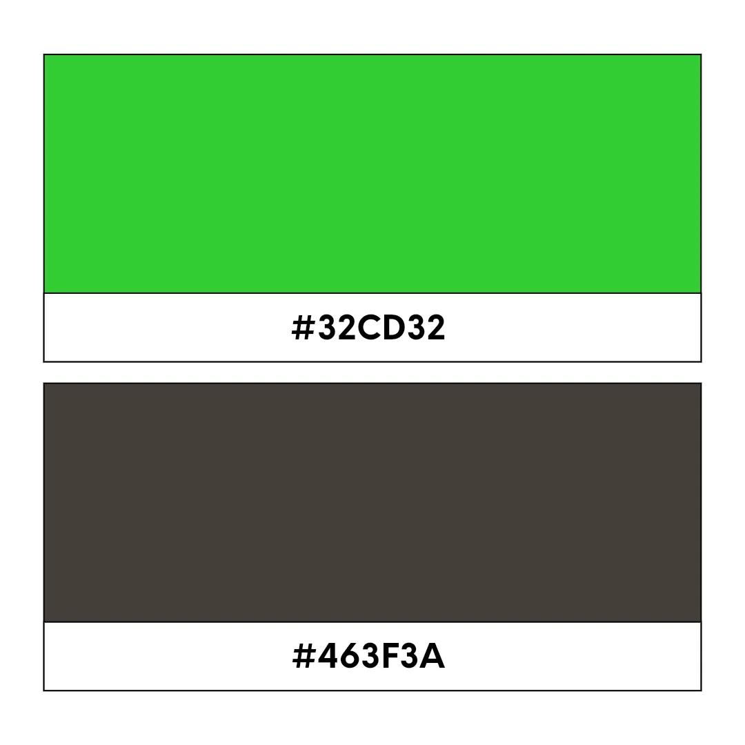 Lime green code: #32CD32, Charcoal grey code: #463F3A