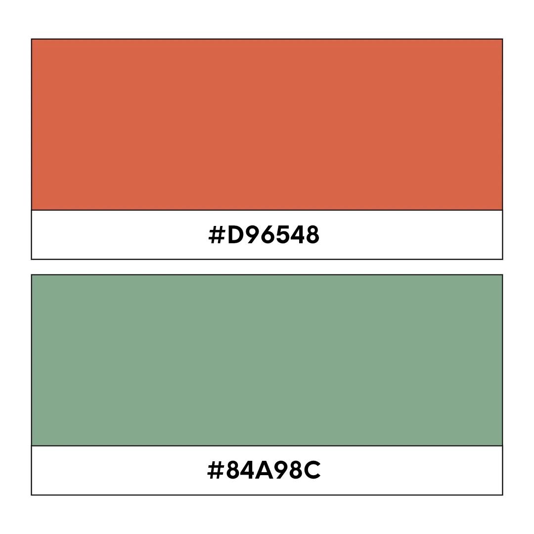 Terracotta and sage green weave together to offer a synergetic color palette that exudes feelings of warmth. The inviting terracotta evokes a sense of earthiness and optimism, while the soothing sage green brings a feeling of tranquility and funky freshness. This rich combo is ideal for brands associated with wellness, sustainability, or charity.