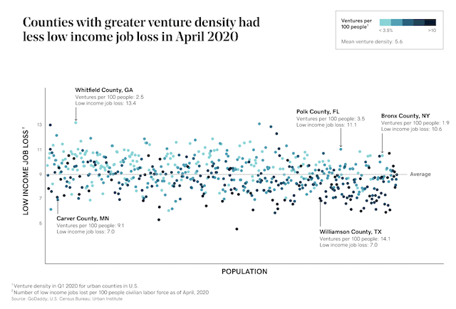 The new findings look at ventures in the age of COVID-19. GoDaddy gathered the data between January 20 and April 27, when COVID-related job loss was at its peak. This new data reinforces the earlier conclusion that venture density, even in the midst of economic shock, increases economic resilience.