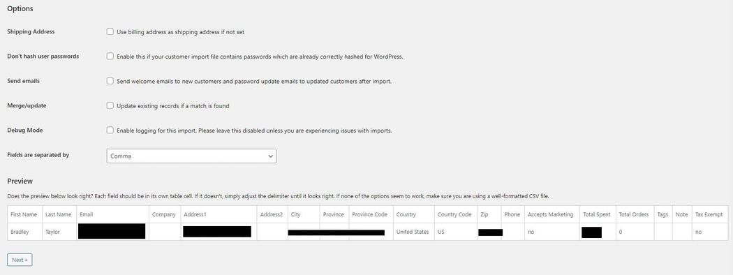 Upload your file and click Next. You’ll then need to configure a few settings. Among these are the options to merge existing records and automatically send welcome emails to customers after import. After you configure your settings, you can review a preview of the table to quickly check for any errors.