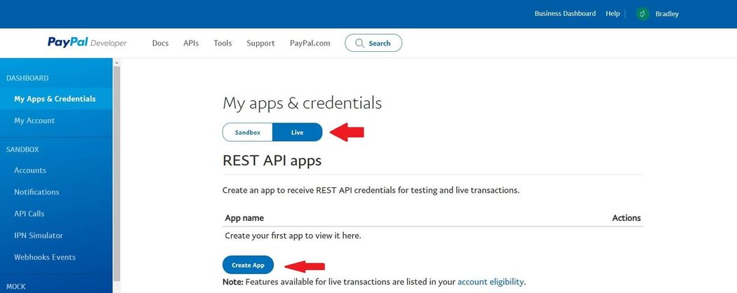 From the Dashboard, go to My Apps & Credentials. Select the mode Live (choose Sandbox if you want to run a test payout) and then click Create App.