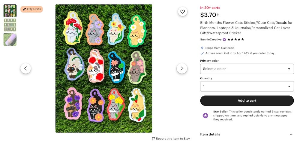 Low-cost, high-volume, and endlessly customizable, stickers are a POD winner. They appeal to kids and adults, work across nearly every niche, and are often bought in sets. They're also great for bundling or as add-ons to larger purchases. Many people offer POD sticker bundles on sites like Etsy: