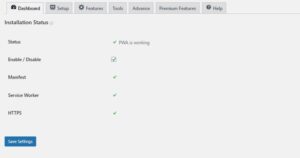 Upon activating the plugin, the PWA will automatically be installed and enabled. You’ll then be taken to a dashboard showing the PWA’s status. This page is also where you can disable/enable the app as needed.