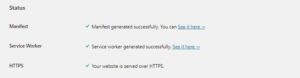 At the bottom of the settings page, you’ll see the status of the application. There you can verify that the manifest and service workers were successfully generated and that the site is being served over HTTPS.