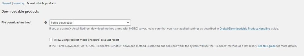 The file download method will determine how customers can access their orders. This is an important setting as protecting file access is crucial to having a profitable digital downloads store.