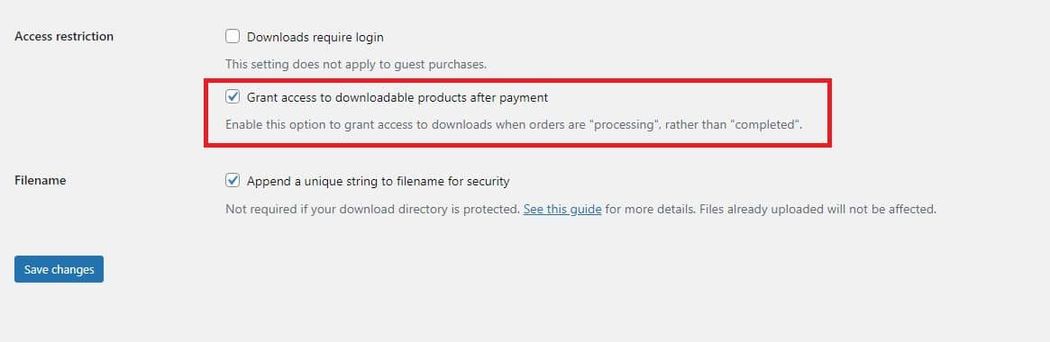 Below the file download method, are settings to determine access restriction. There, you have the choice to grant access to downloads immediately after payment. This means that downloads will be available to customers even if their orders still have a “Processing” status.