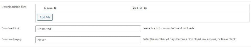 This will open new fields in the Product data tab. There you can add the downloadable files, set the download limit and the download expiry. If you want the download link to never expire, leave the expiry field blank.