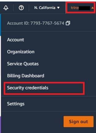 After your account is set up, go to the Management Console to get the credentials needed to connect your AWS account to the WooCommerce plugin. Select Your username > Security Credentials.