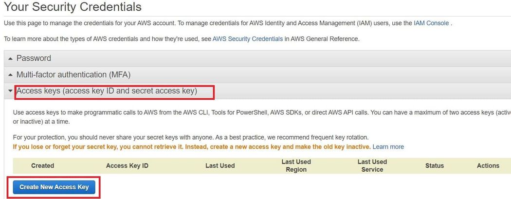 Go to Access keys (access key ID and secret access key) and select Create New Access Key.
