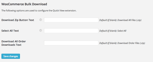 If you want to customize the display, go to WooCommerce > Settings > Products > Downloadable Products. Under WooCommerce Bulk Download, you will see the options to change the button text as well as the select all text.