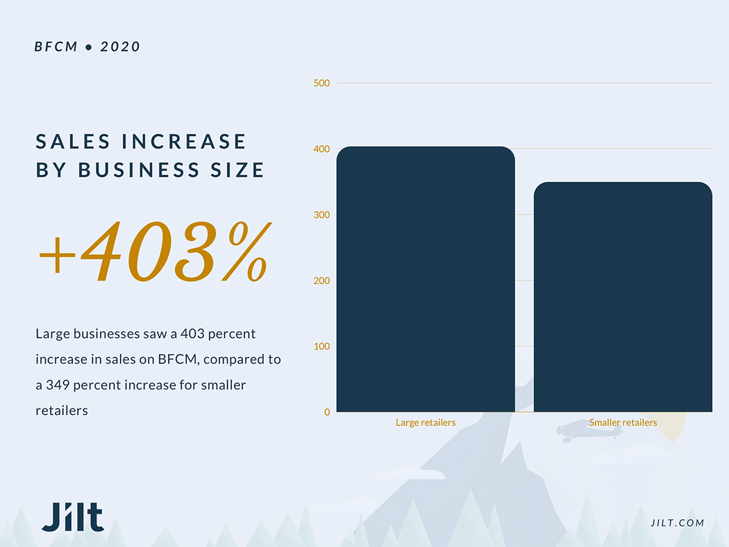 Large retailers saw a 403 percent increase in sales this year compared to their October averages; smaller retailers saw a 349 percent increase. While both numbers are great, it’s another sign that the enterprise brands are continuing to outpace everyone else. (The market share of the top 10 eCommerce brands in the U.S. is currently around 60 percent.)